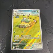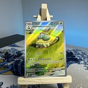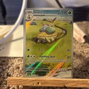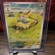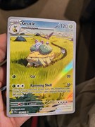 I also like how simple and calm the whole Pokémon card looks. Grotle is known to not be violent, and this card perfectly highlights that fact. The tall grasses, ponds in the background, Grotle giving a ride to other Pokémon… It’s a beautiful, cute card.
