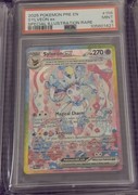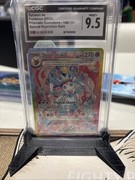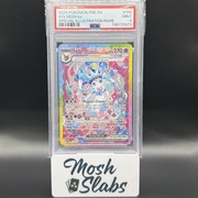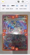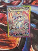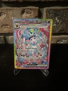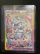 If we take a closer look at the prestigious card, we see that Sylveon is sitting on some type of pillow, covered in all kinds of pink and blue flowers. Some ribbons are present as well next to some confetti streamers. The rainbow border and terastallization surely gives the card more color next to the overall pink look. An absolutely stunning card if you ask me!